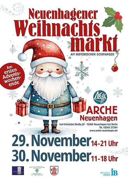 Wie immer am ersten Adventswochenende lädt die Arche zum Kult-Weihnachtsmarkt in Neuenhagen bei Berlin rund um den alten Dorfkern und auf den Hof der ARCHE Neuenhagen ein. An zahlreichen Ständen werden kleine Geschenke und weihnachtliche Dekorationen und Accessoires angeboten. Für das leibliche Wohl sorgen die zahlreichen Stände mit allerlei kulinarischen Leckereien. Von Deftigem, wie etwa Bratwurst und Steak bis hin zu Donuts und kandierten Äpfeln ist für jeden Geschmack etwas dabei. Natürlich fehlen auch Glühwein und Kinderpunsch nicht. Ein buntes Bühnenprogramm und viele Attraktionen für Kinder wie beispielsweise Karussells, Kinderschminken und Basteln runden den Weihnachtsmarkt ab.