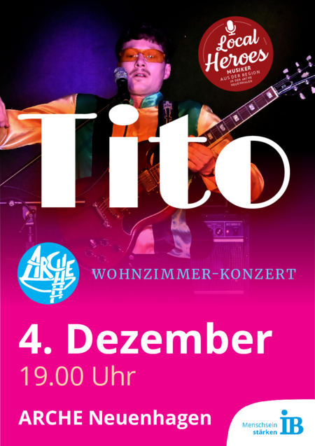 Viele kennen Tito vom „Pop Up Club“ Neuenhagen, der in der Corona-Zeit entstand, oder von der Band Radio Hoppegarten: Der Ausnahmekünstler, der wortakrobatisch zwischen Funk, Pop, NDW und Singer/Songwriter umherspringt, gibt am 4. Dezember um 19 Uhr ein Wohnzimmerkonzert in der Arche Neuenhagen. „Ich freue mich sehr über Titos Auftritt bei uns,“ findet Arche-Leiter Stephen Ruebsam. „Genau das meine ich immer mit unserer Reihe ,Local Heroes’: Künstler mit eigenem Stil und eigener Musik, ihren Wurzeln hier bei uns in der Region.“ Mit großartigen Texten, machmal mit Tiefgang, manchmal einfach Slapstick, begeistert Tito bei seinen hochmusikalischen, im besten Sinne ver-rückten Solo-Konzerten bundesweit. Im Advent kommt er nach Hause in die Arche.
