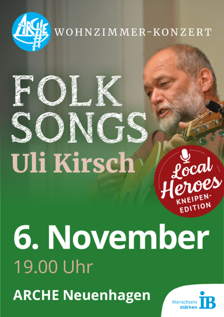 Er ist einer der „alten Hasen“ der Folkmusik in Deutschland, insbesondere des Irish Folk und der Musik der 70’er: Uli Kirsch spielt am 16. Oktober um 19 Uhr ein Wohnzimmerkonzert in der Arche Neuenhagen. Ohne Technik, ganz in der Tradition der Sessions in Irish Pubs, spielt er auf der Gitarre irische Folksongs, als wäre er damit aufgewachsen. Er sieht aus wie ein Ire und singt wie ein Ire - seine starke, rauchige Stimme und die Leidenschaft für die Musik zieht einen sofort in den Bann. Der Wahl-Bernauer ist einer dieser Barden, die in Kneipen spielen, Leute zum Mitmachen animieren und einfach aus dem Bauch heraus singen. Das Konzert von Uli Kirsch findet dazu passend im Café der Arche statt, damit das Bier gleich in der Nähe ist.