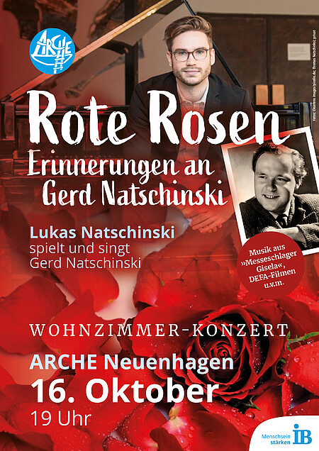 Am 16. Oktober 2026 lädt der Pianist und Sänger Lukas Natschinski um 19 Uhr zum Konzert mit Musik seines Vaters in die Arche Neuenhagen. Gerd Natschinski war einer der großen Komponisten und Intendanten der DDR: Die Operetten „Messeschlager Gisela“ und „Mein Freund Bunbury“ waren Dauerbrenner, Songs wie „Zwei Gute Freunde“ mit Fred Frohberg oder „Rom-ta-rom“ mit Regina Thoss sind vielen DDR-Fans noch im Ohr. Natschinski prägte mit Kinder- und Jugendliedern im Osten eine ganze Generation. Sein Sohn Lukas führt das musikalische Erbe seiner Familie fort als Pianist, Sänger und Komponist. Er spielt in der Arche die beliebtesten Melodien seines Vaters, singt bekannte Lieder und teilt persönliche Geschichten aus dem Leben seines Vaters – mit ganz vielen Bildern auf der großen Leinwand. „Rote Rosen – Erinnerungen an Gerd Natschinski“ ist eine Hommage an einen der großen Namen der Nachkriegs-Musikgeschichte.